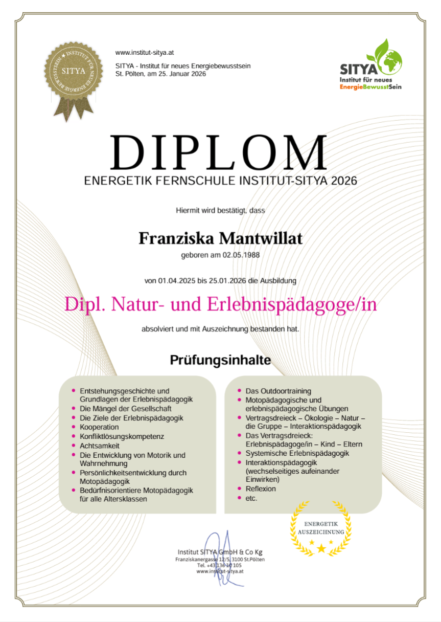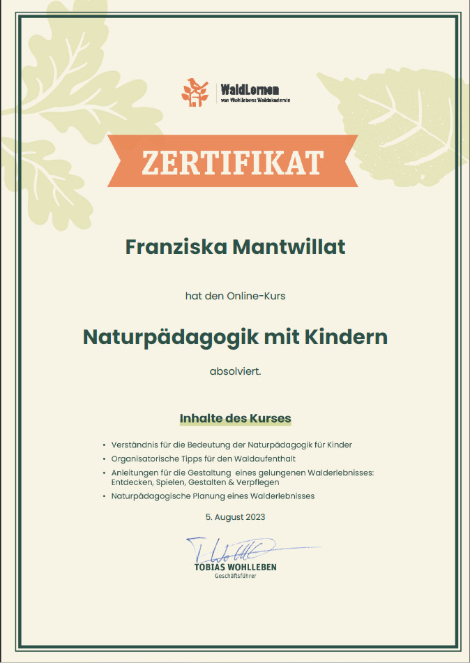 Ich glaube daran, dass Kinder durch direkte Erfahrungen in der Natur nicht nur Wissen erwerben, sondern auch Kreativität, Verantwortungsbewusstsein und eine tiefe Verbindung zur Umwelt entwickeln.
